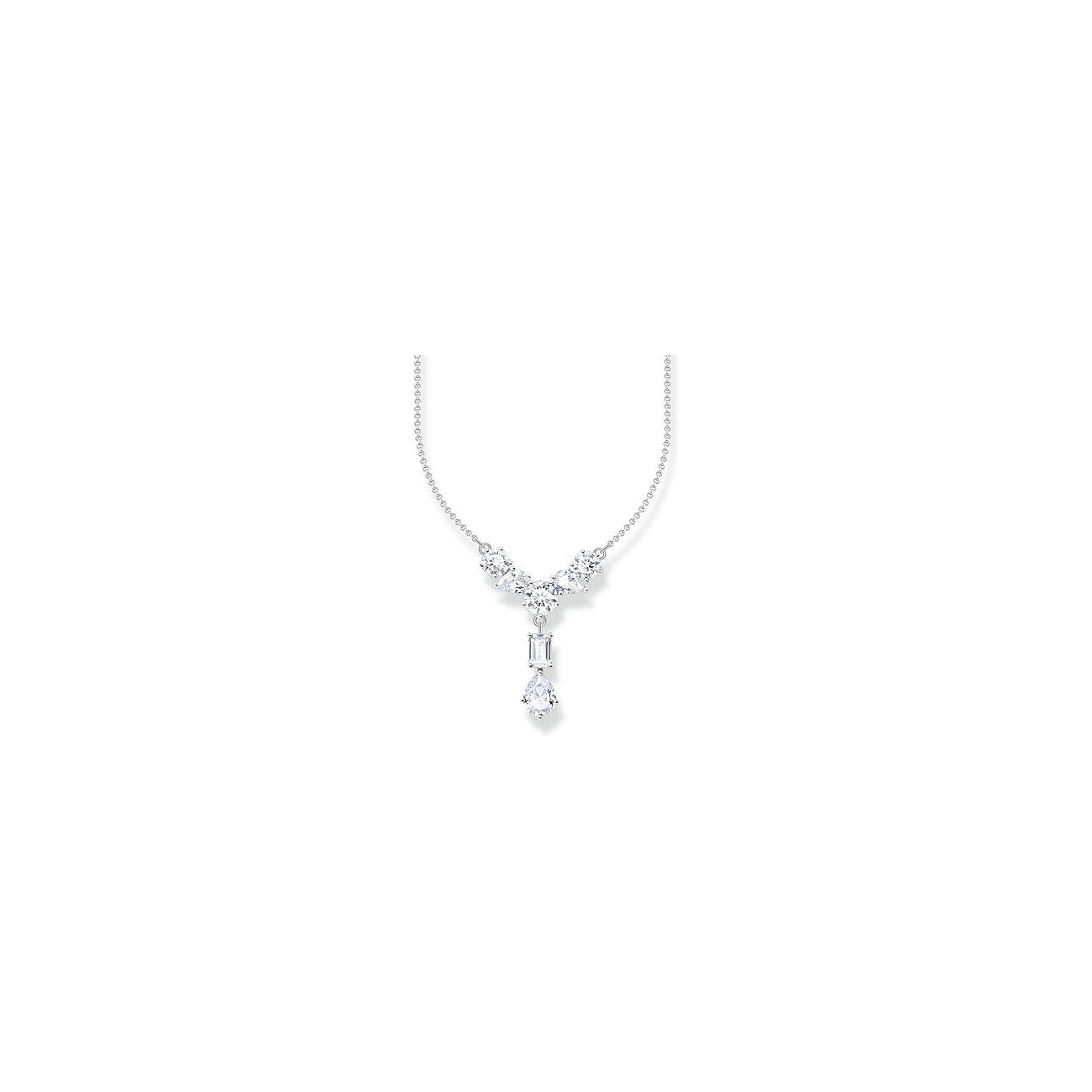 - Anhängermotiv: Y‑Form mit sieben weißen Zirkonia‑Steinen in verschiedenen Schliffen (z. B. Oktagon, Tropfen, Rundschnitt)