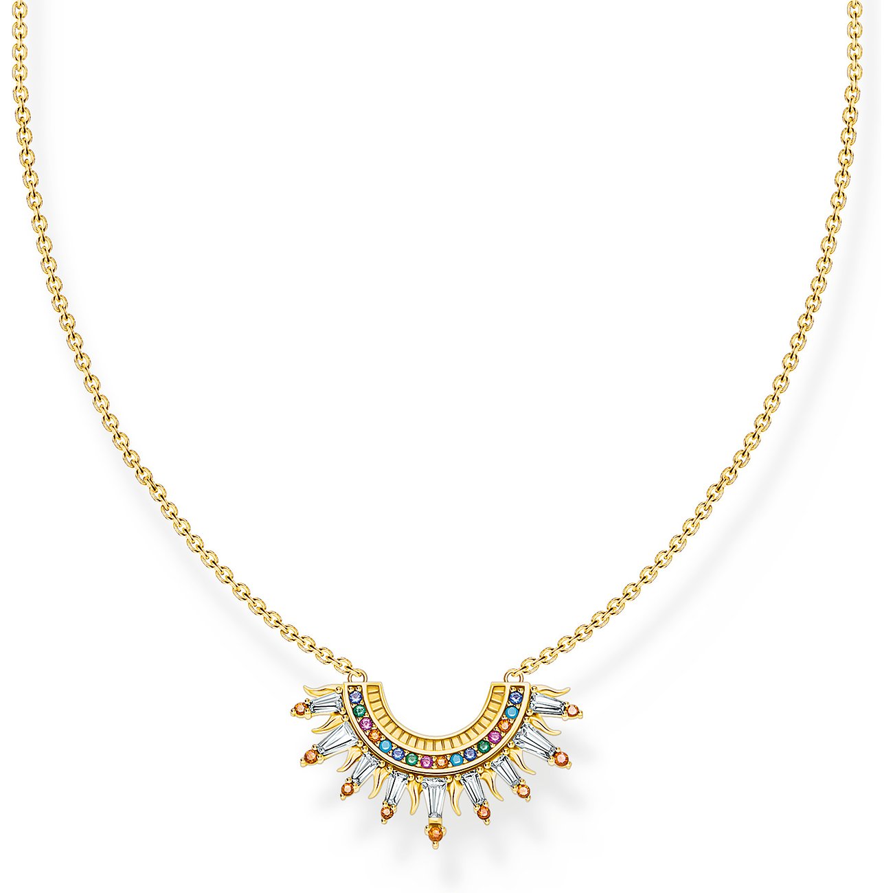 - Farbe: Goldfarben (Kette) mit bunten Steinen im Anhänger (orange, weiße Baguette‑Cut‑Steine usw.)