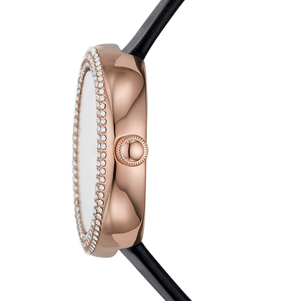 - Exquisites Design mit roségoldfarbenem Edelstahlgehäuse und schwarzem Lederarmband – ideal für modebewusste Frauen, die zeitlose Eleganz schätzen