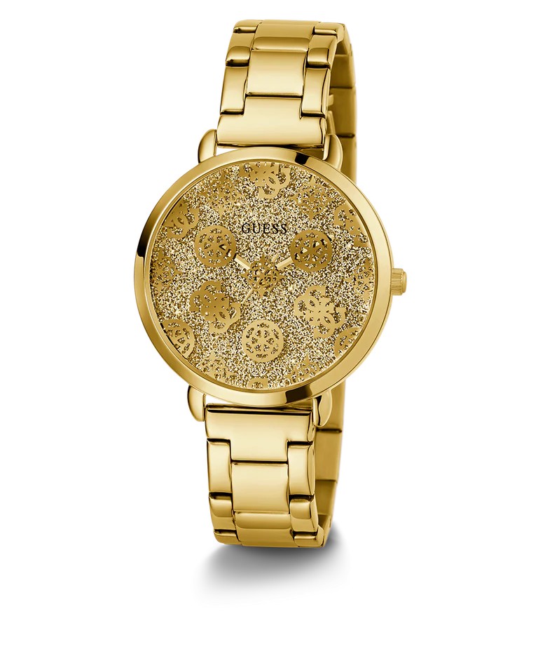 - Elegantes Design: Goldfarbene Damen-Armbanduhr mit stilvollem, funkelndem Zifferblatt und ikonischem GUESS-Logo.