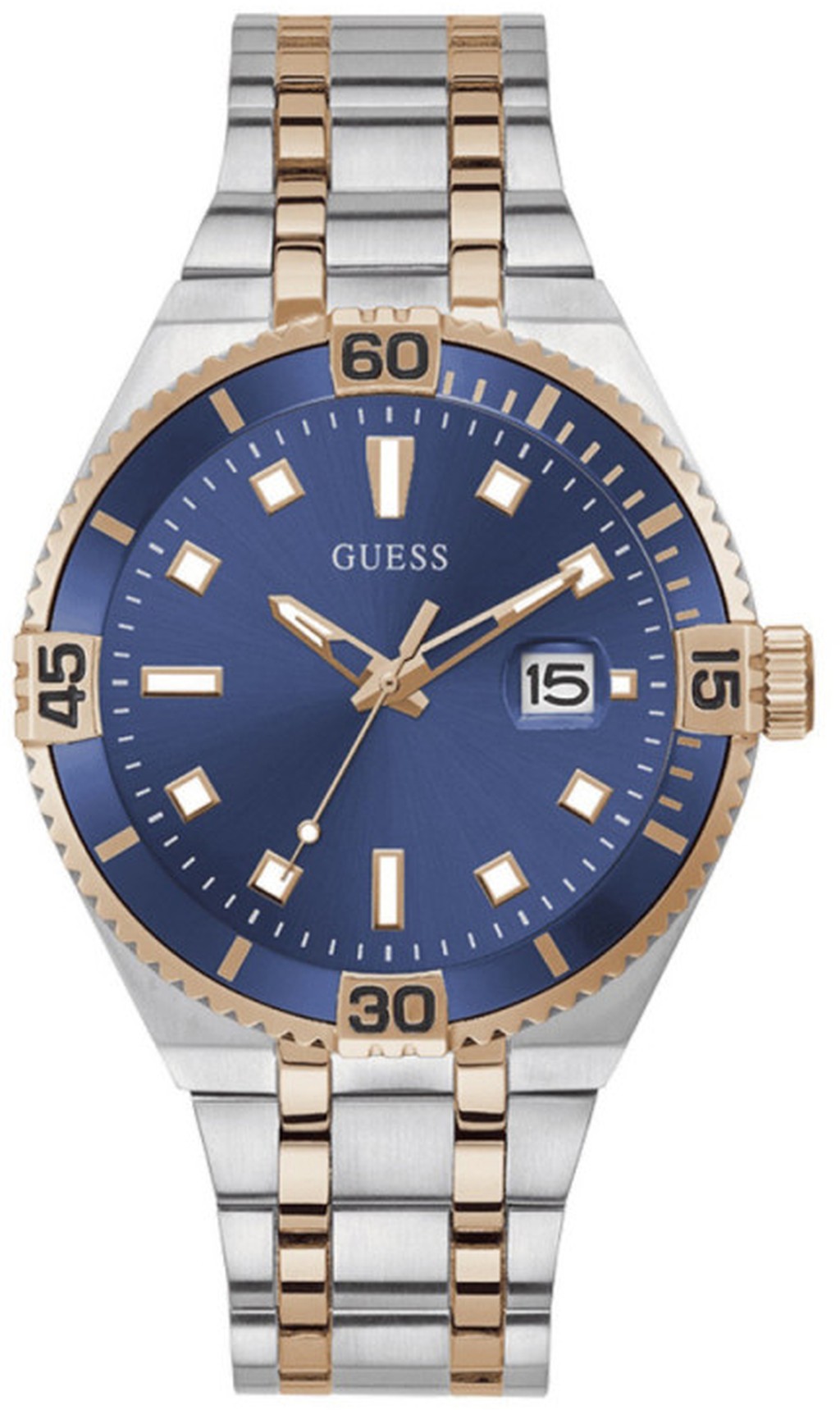 - Edelstahlgehäuse, silber- und rosegoldfarbene Beschichtung / blau, poliert / mattiert