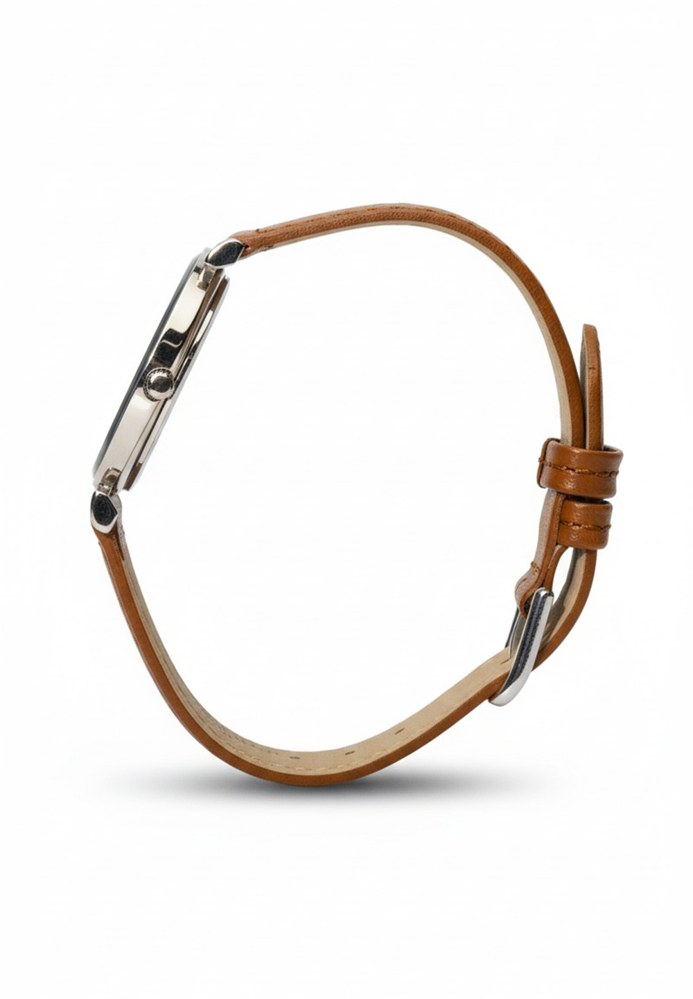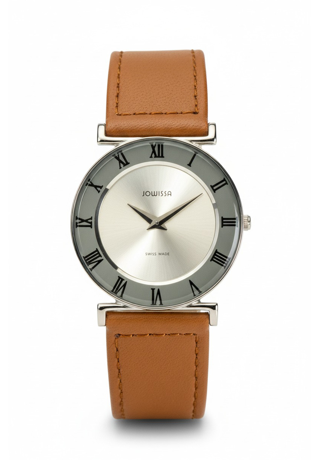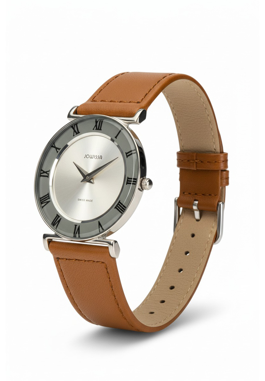 - Kombination aus edlem Edelstahlgehäuse und braunem Lederarmband für zeitlosen Look