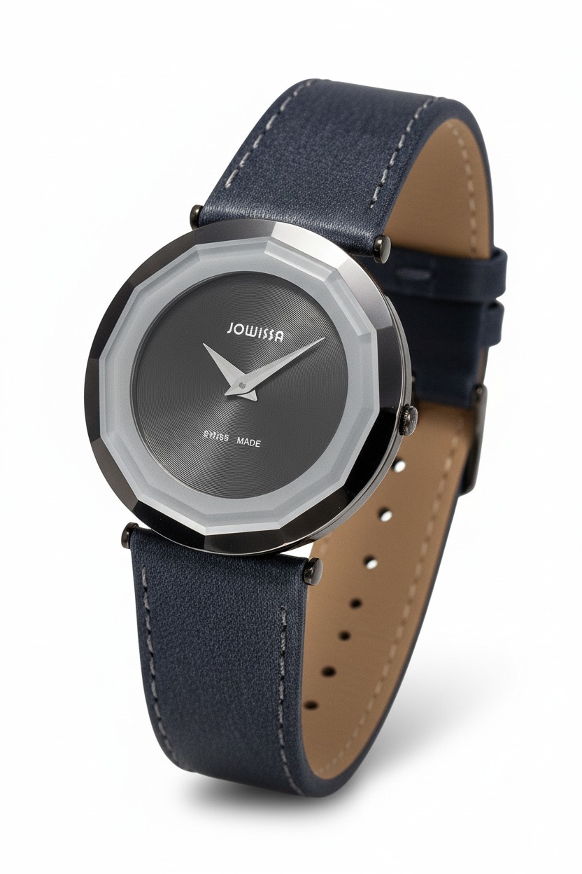 - Robustes Edelstahlgehäuse in Schwarz kombiniert mit einem edlen blauen Lederarmband für hohen Tragekomfort und zeitlose Eleganz