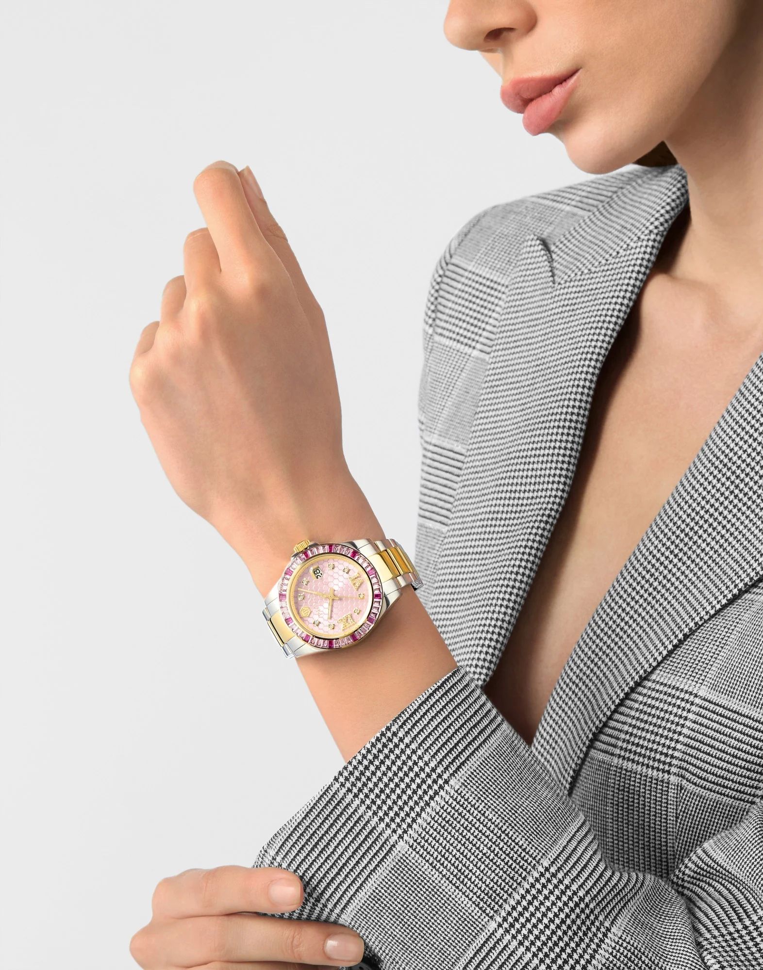 - Rosafarbenes Zifferblatt mit Kristallakzenten sorgt für feminine Ausstrahlung.