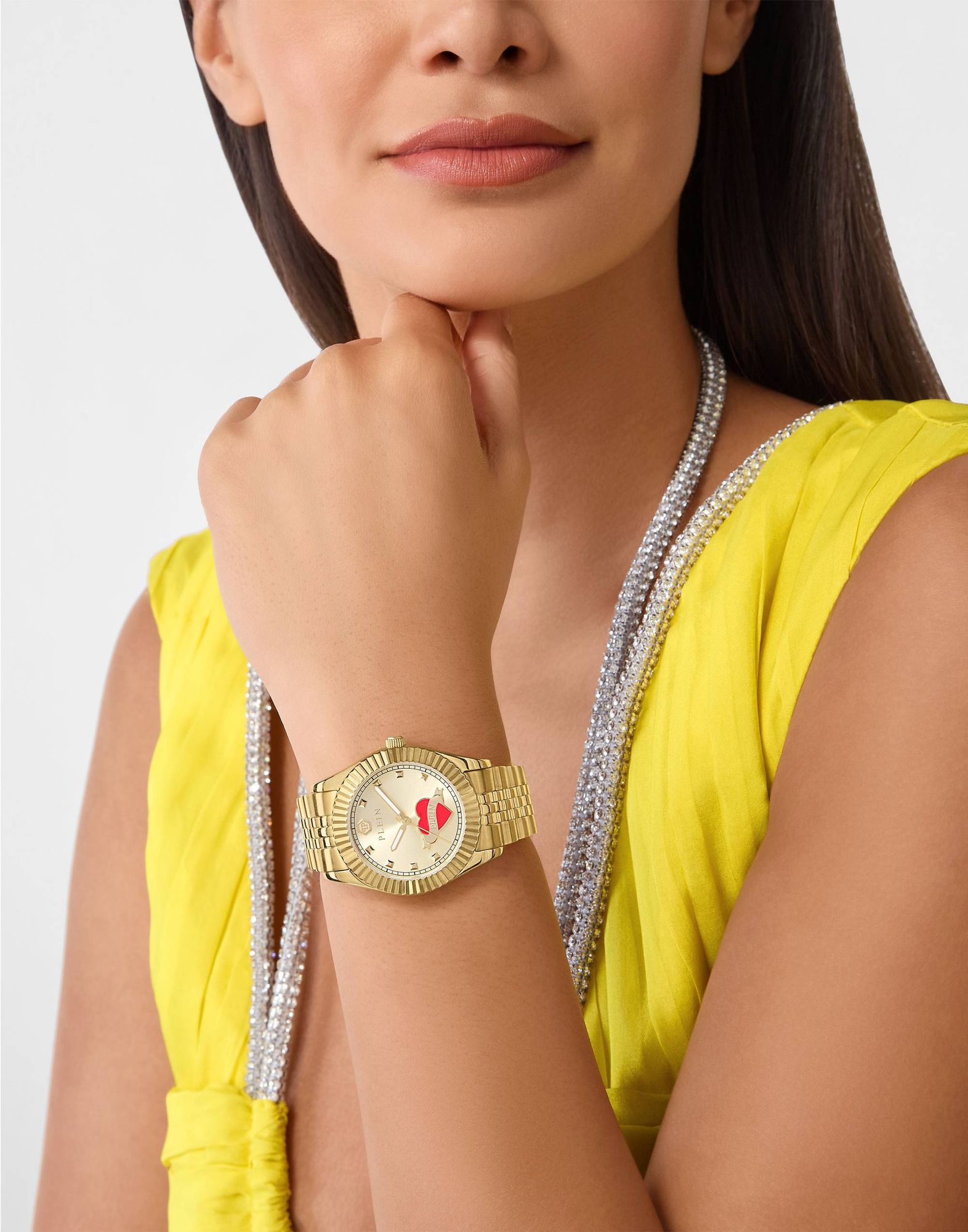 Diese bezaubernde Uhr strahlt dank eines lebendigen Herzsymbols auf der 6-Uhr-Position einen verspielten Geist aus. Die Plein Valentine verleiht jedem Blick auf Ihr Handgelenk einen Hauch von Verspieltheit im perfekten Philipp Plein-Stil. Die Plein Valentine ist perfekt für die Weihnachtszeit und auch in einem wertvollen Geschenkset erhältlich, das eine Uhr mit rotem Lederarmband und passendem Armreif enthält. Plein Valentine, eine himmlische Verbindung.
