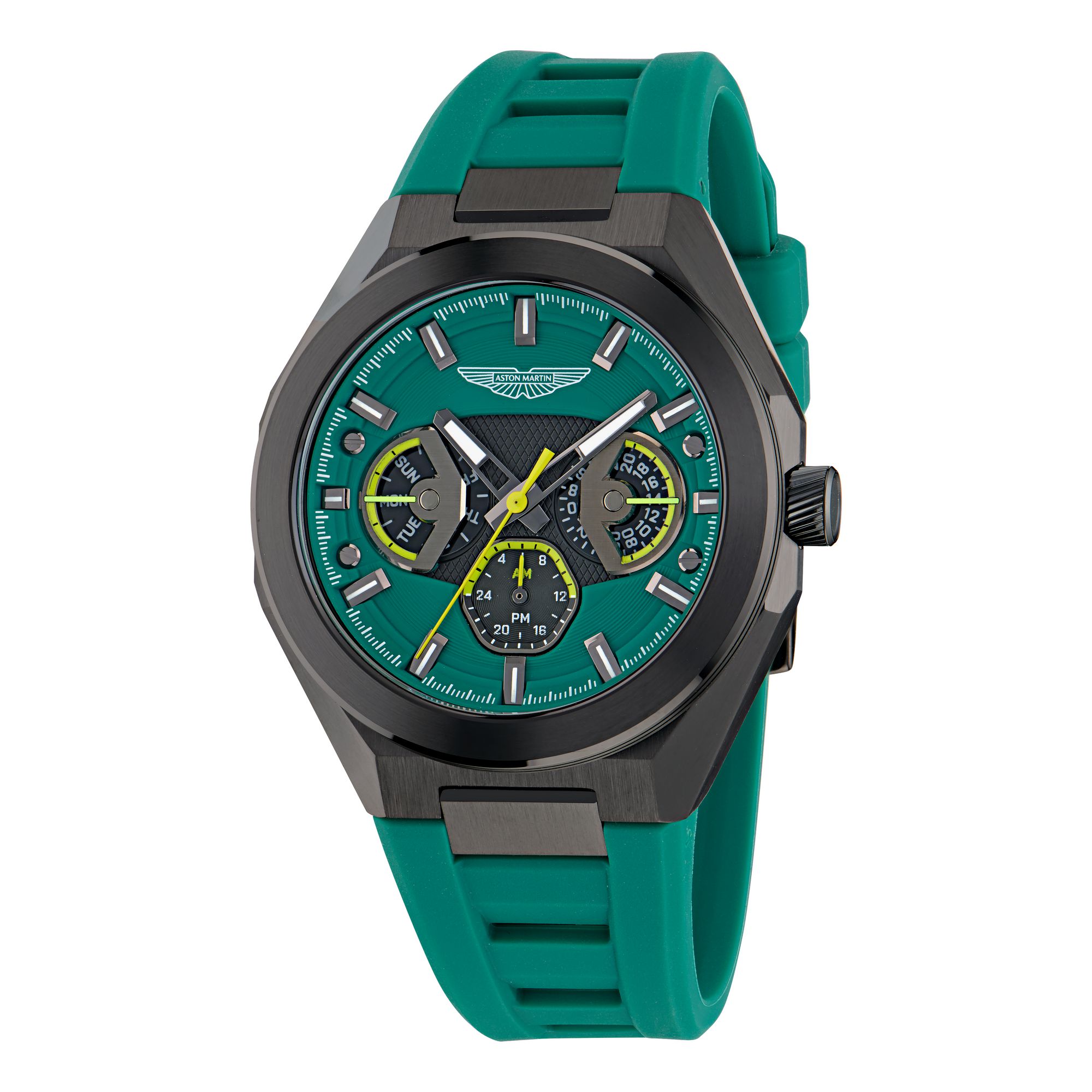 - Grünes Zifferblatt und grünes Silikonband setzen Farbakzente inspiriert von der Rennsport‑DNA der Marke.