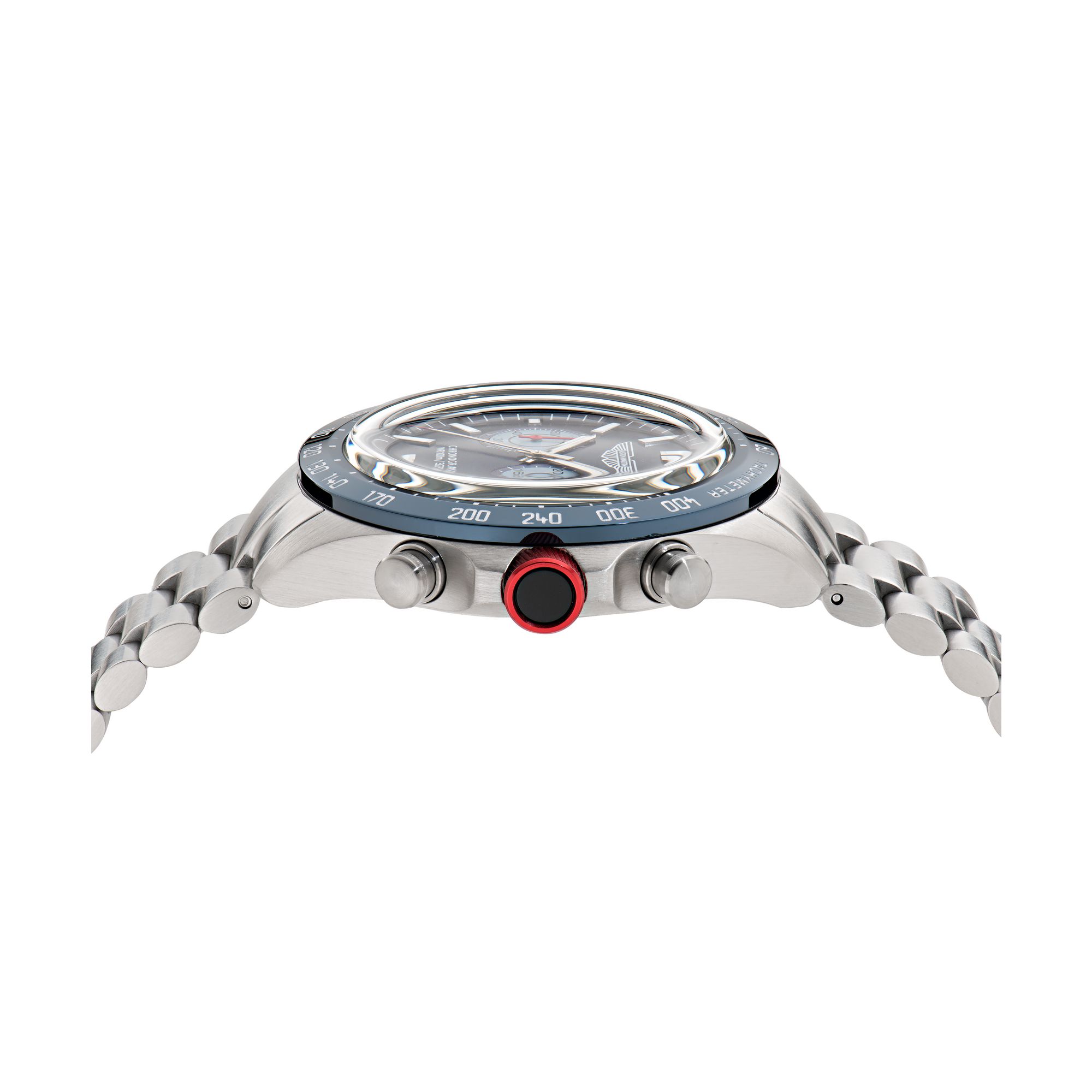 - Blaues Zifferblatt kombiniert mit silbernem Edelstahlarmband – ein stilvoller Farbkontrast, der Aufmerksamkeit zieht.