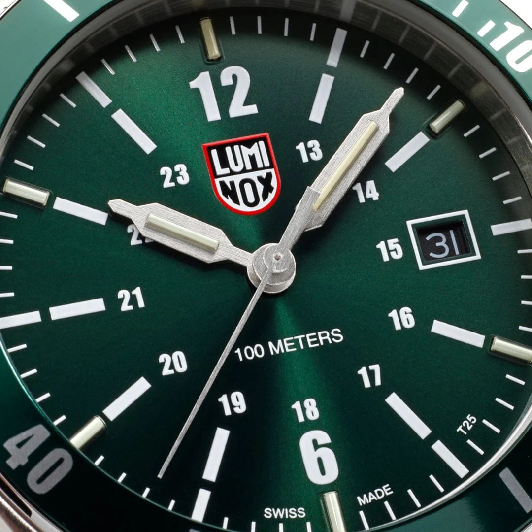 - Leuchttechnik: Luminox Light Technology mit dauerhaft selbstleuchtenden Röhrchen auf Zeigern und Indexen