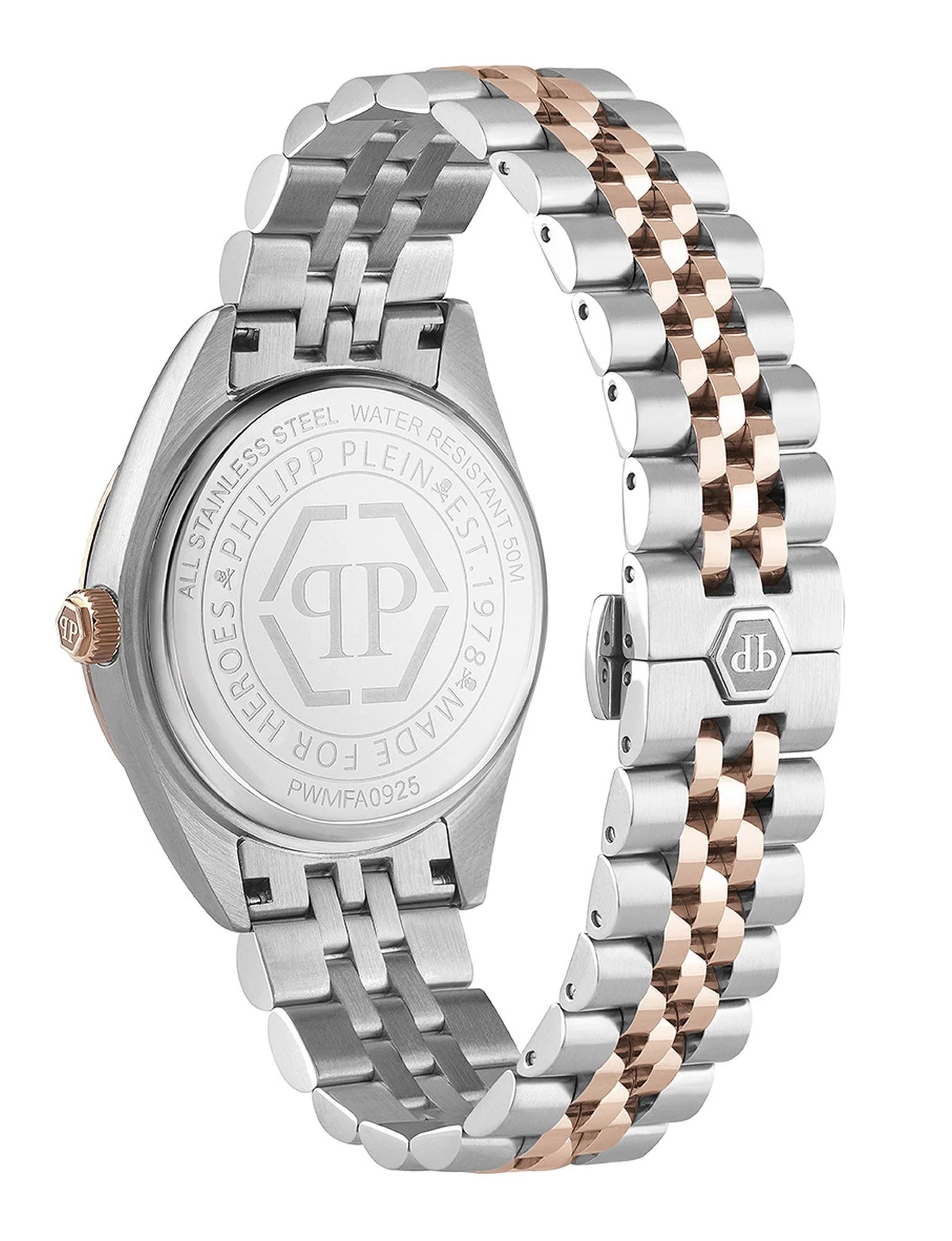 - Gehäusematerial: Edelstahl (Two‑Tone, silber + roségoldfarben)