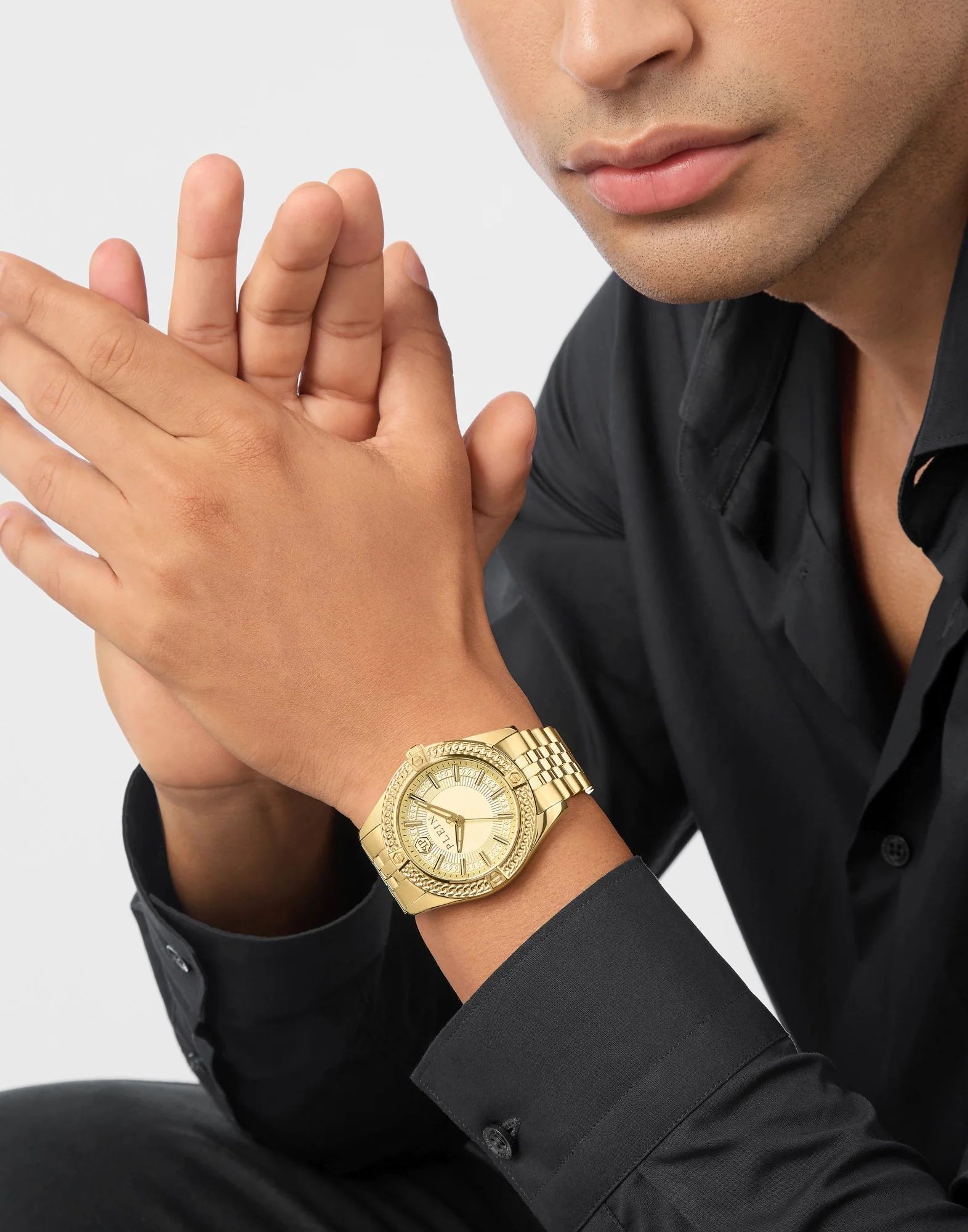 - Goldfarbenes Edelstahlgehäuse und Armband mit edlem Finish – auffällig und doch elegant