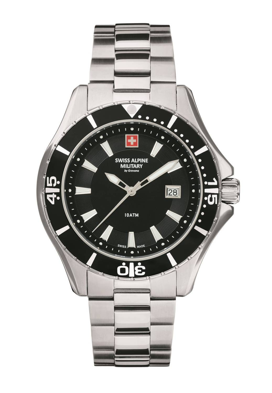 Sportliche Swiss Alpine Military Herrenuhr 7040.1137. Zifferblatt: Schwarz, Armband: Silber, Gehäuse: Silber. Lünette: Schwarz Für einen hohen Tragekomfort sorgt das hochwertige Armband aus Edelstahl. Der angegebene Prüfdruck (Wasserdichtigkeit) beträgt 10 ATM, und sichert eine gute Alltagstauglichkeit. Mit kratzfest gehärtetem Mineralglas.