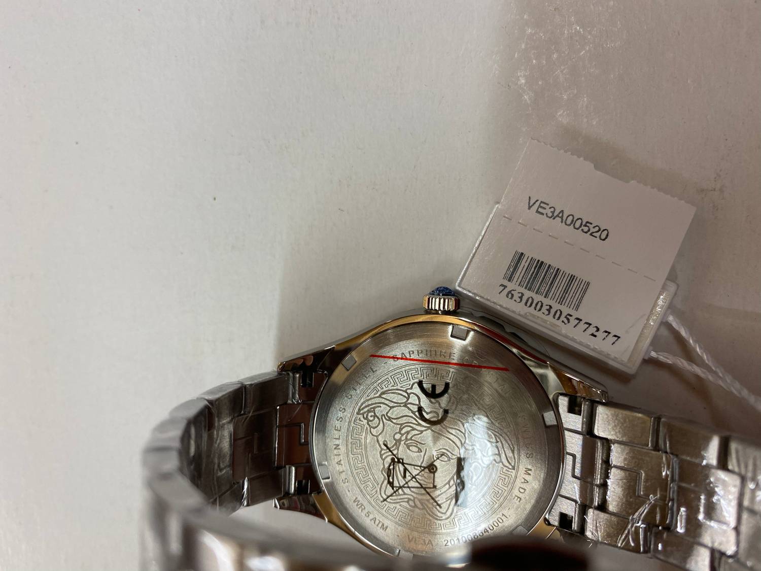 Das Zifferblatt enthält ein Datumsfenster, ein Versace-Logo im 12-Uhr-Bereich und weiße Indizes mit kleinen römischen Ziffern für die Stundenskala